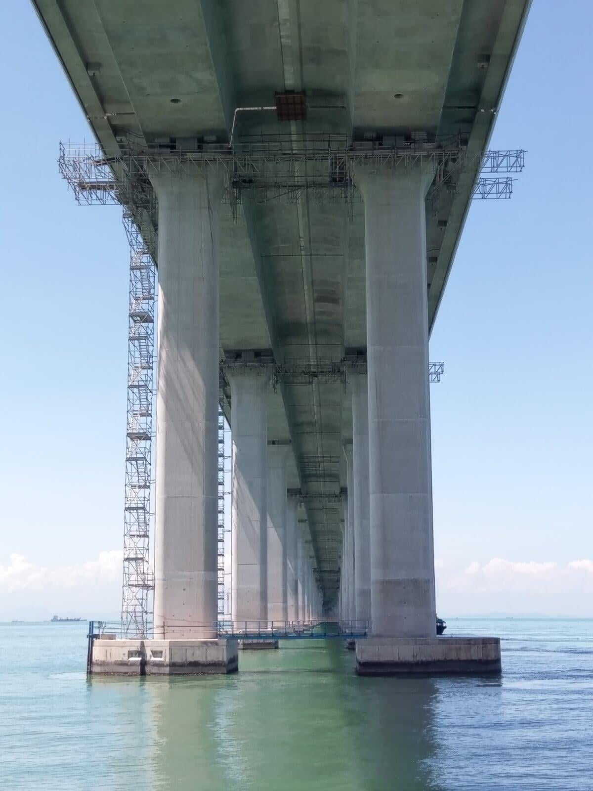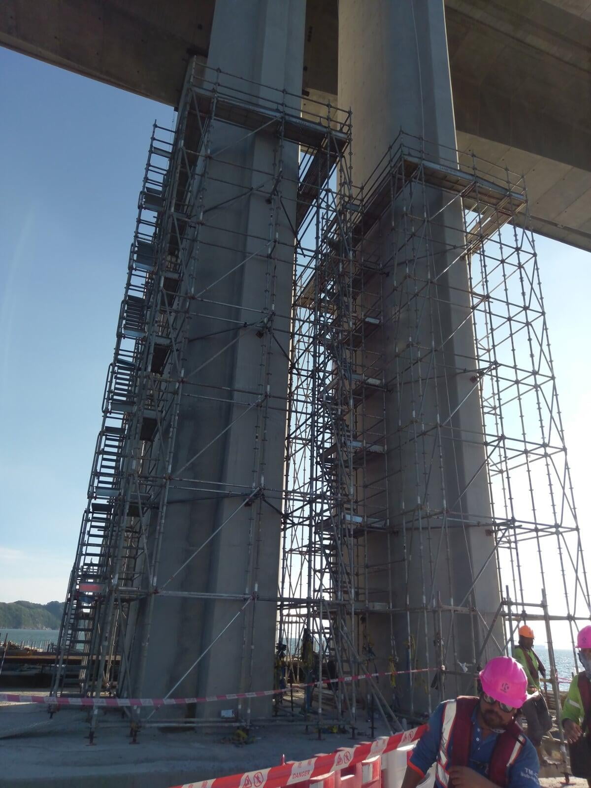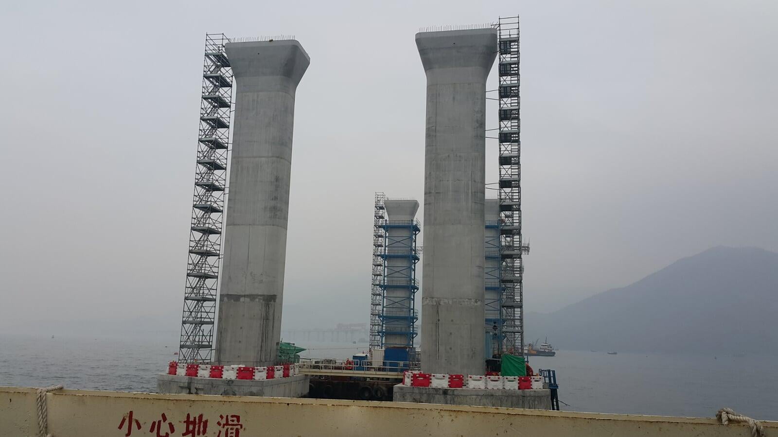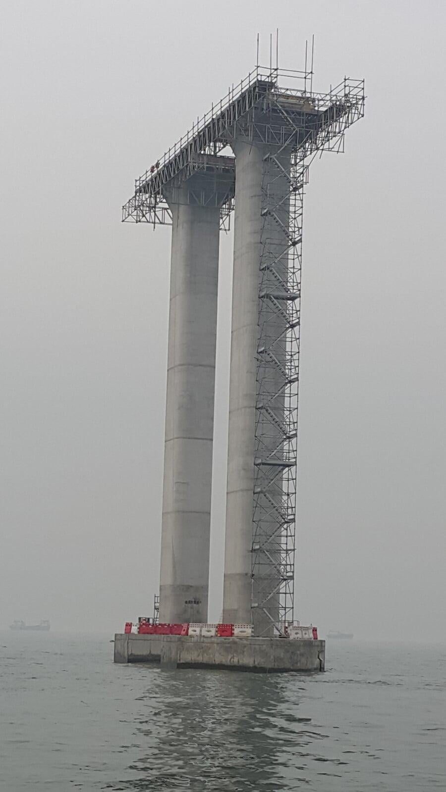 The main contract was for the over sea bridge connecting Hong Kong to Macau and Zhuhai. We were the primary scaffolding contractor for this project. We carried out two packages for this job. One was to design, supply and build access towers around the piers providing access to government officials in carrying out rebound hammer and coring test to assess the density of the concrete piers. Another was to supply grade A especially trained scaffolders for erection of pier head suspended access reaching up to 45 meters above pile cap.